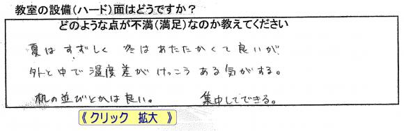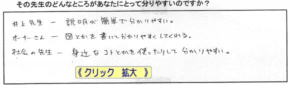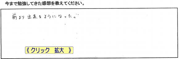 《 画像は、クリックすると拡大します 》 28年度:卒業生へのアンケ−ト 取手松陽高進学 Aさん ★ 教室の設備面はどうですか。 『夏は涼しく、冬は暖かくて良いが、外と内で 温度差がけっこうある気がする。 机のならびとかは、よい。 集中してできる。』 ★ 教えてくれた先生のどんなところが分かりやすいのですか。 『井上先生 - 説明が簡単で、分りやすい。 オ-ナ-さん - 図とかを描いて分りやすくしてくれる。 社会の先生 - 身近な事とかを使ったりして、分りやすい。』 ★ 教室で勉強してきた感想を教えて下さい。 『前より出来る様になった』 ありがとうございます、高校でも頑張ってください。