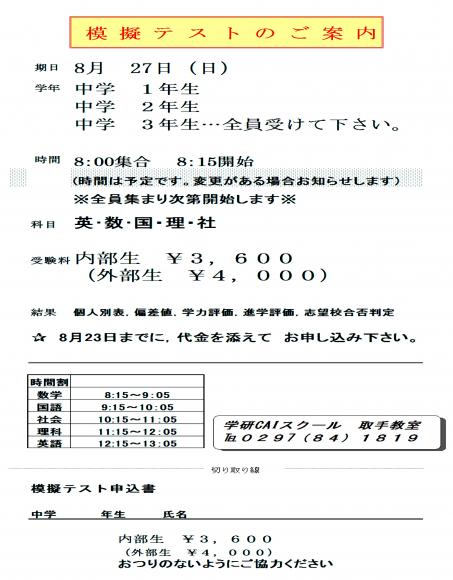 2017年08月24日 木曜日 中学模擬テスト 開催 ( 教室からのお知らせ )