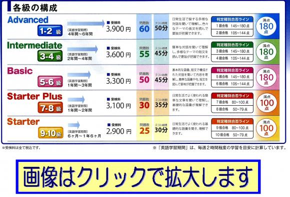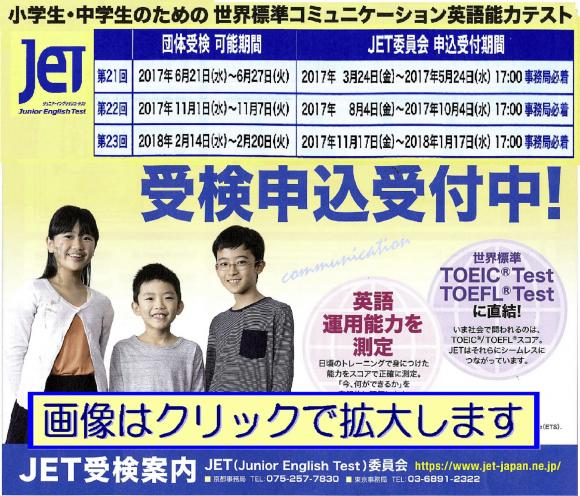 《 JET(TOEICへ直結)子供英語能力判定試験開催 》 従来の暗記や文法読解力(受験英語)ではなく よりコミュニケ-ション英語能力を問うTOEICへ直結する 試験です。 実施日 11月1日〜7日 締め切り 10月2日 費用 表を参照 詳細は、お電話でお問い合わせください。 Tel 0297-84-1819