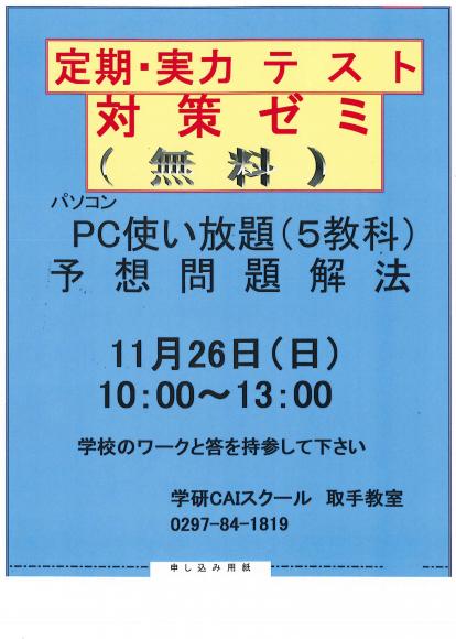 《 画像は、クリックすると拡大します 》 こんにちは、学研CAIスク-ルです。 今週来週で各中学校とも期末試験が行われていますね。 学研でも試験対策を何回も行っています。 特に3年生は、内申につながる大切な試験ですので 日頃の頑張りを存分に発揮してください。 さらに、学研では冬期『 進学進級準備講座 』として 4日間の無料授業+特別講習を行います。 これは、小学生・中学生共に1・2学期の総復習と 先取り学習で新学期の準備を行うものです。 この機会に学研の個別学習をお試しください。
