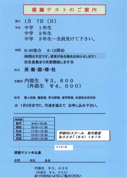 中学生対象:茨統テスト開催のお知らせ ( 教室からのお知らせ )