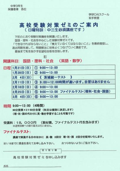 《画像は、クリックすると拡大します》 『高校受験対策:日曜特訓』開催のお知らせ 理科・社会を中心にした受験対策ゼミです。 苦手科目をフォローし、完成を目指します。 「できるはずの問題を間違えない」「ミスをしない」 を目標に「できなければならないこと」「できること」 から確実に積み上げ、効率的な勉強方法を身につけ 成績アップを目指します。 開講科目: 理科・社会(英語・数学・国語) 期日 1月 21日 (日) 1月 28日 (日) 2月 4日 (日)茨統テスト 2月 11日 (日) 2月 18日 (日) 2月 25日 (日) 3月 4日 (日) 時間 9:00〜13:00 (4時間) 国語・理科・社会(英語・数学) (科目については変更可能です) 受講料:(教材費を含みます) 18,000 円 詳細はお電話でお問い合わせ下さい。 TEL 0297-84-1819