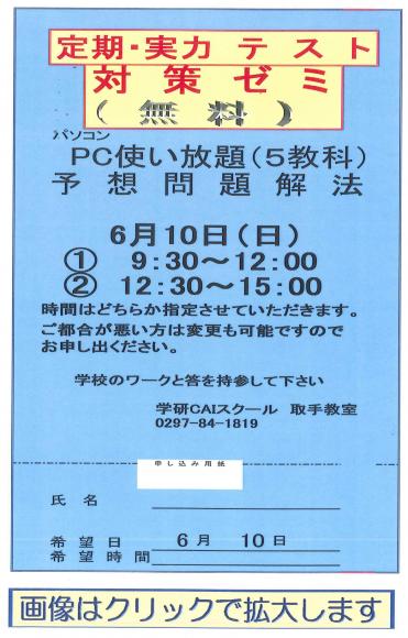 《画像は、クリックすると拡大します》 《 無料:期末テスト対策授業のお知らせ 》 期日 6月10日(日) 時間 1回目 9:30〜12:00 2回目 12:30〜15:00 学校のワークと解答を持参して下さい