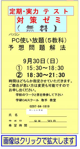 2018年09月29日 土曜日 取手の中学生:無料 中間試験対策 ( 教室からのお知らせ )