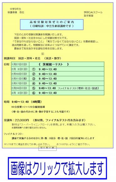 《 県立入試合格対策 =日曜特訓:理社= 》 期日 1月27日〜3月3日 6講座 時間 9:30〜13:40 全員志望高校合格を目指して、頑張ろう! 詳細はお電話でお問合せ下さい。 TEL 0297-84-1819