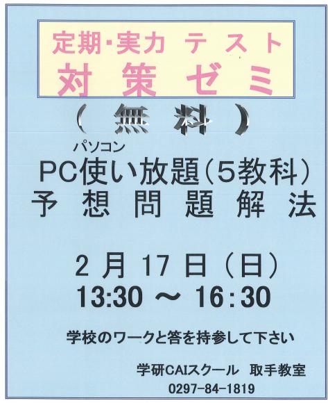 《画像は、クリックすると拡大します》 《 無料:定期テスト対策授業のお知らせ 》 期日 2月17日(日) 時間 13:30〜16:30 学校のワークと解答を持参して下さい