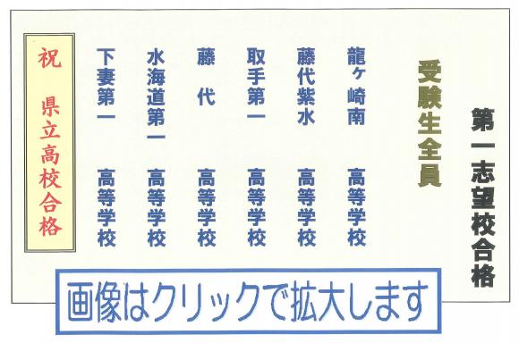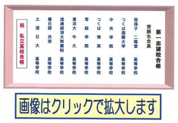 《 私立高校 合格 》 ○ 土 浦 日 大 高等学校 ○ 春 日 部 共 栄 高等学校 ○ 流 通 経 済 大 学 付 属 柏 高等学校 ○ 東洋大 牛 久 高等学校 ○ 常 総 学 院 高等学校 ○ つくば 秀 英 高等学校 ○ 中 央 学 院 高等学校 ○ つくば国際大学 高等学校 ○ 我孫子 二階堂 高等学校 《 私立中学 合格 》 ○ 土浦日大中学教育学校 ○ 東洋大学 牛久中学校 《 県立高校 合格 》 ○ 下妻第一 高等学校 ○ 藤代 高等学校 ○ 水海道第一 高等学校 ○ 取手第一 高等学校 ○ 藤代紫水 高等学校 ○ 龍ヶ崎南 高等学校 皆さんおめでとう御座います 頑張れば必ず、貴方の希望は実を結びます これからも必要な時は本気の出せる大人に 成ってください。 『応援しているゾ!』