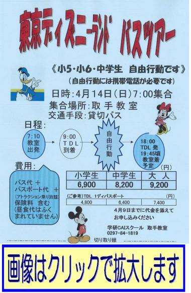2019年04月09日 火曜日 東京ディズニ-ランド・バスツア-のお知らせ31年 ( 教室からのお知らせ ) |