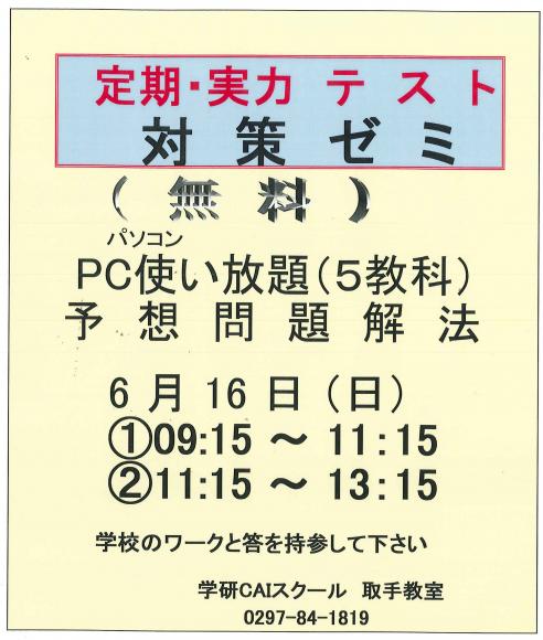 取手の中学生:定期試験対策 《画像は、クリックすると拡大します》 《 無料:定期テスト対策授業のお知らせ 》 期日 6月16日(日) 時間 1回目 9:15〜11:15 時間 2回目 11:15〜13:15 学校のワークと解答を持参して下さい