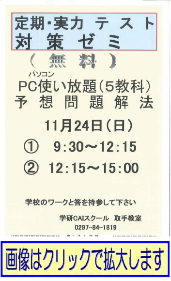 取手の中学生:定期試験対策 《画像は、クリックすると拡大します》 《 無料:定期テスト対策授業のお知らせ 》 期日 11月24日(日) 時間 1回目 9:30〜12:15 時間 2回目 12:15〜15:30 学校のワークと解答を持参して下さい