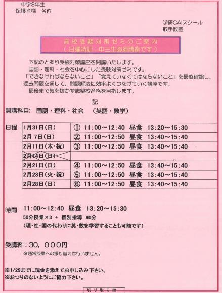 取手の中3生日曜特訓のお知らせ ( 教室からのお知らせ )