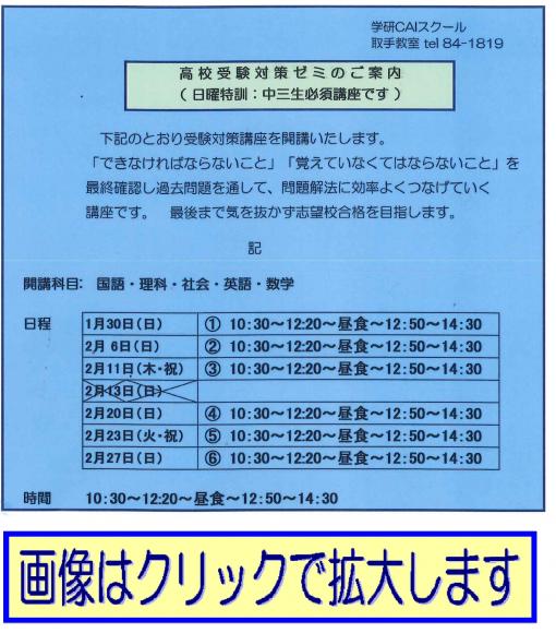 《 県立入試対策ゼミ:英数国理社 》 期日 1月20日〜2月27日 6講座 時間 10:30〜14:30 全員志望高校合格を目指して、頑張ろう! 詳細はお電話でお問合せ下さい。 学研 CAI スク-ル 取手 教室 TEL 0297-84−1819