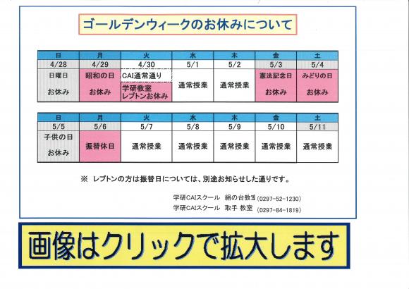 《ゴ-ルデン ウイ-ク のお知らせ 》 いつも、おせわさまになっております。 連休は、カレンダ-通りに授業を行います。 振替等については、各担当に確認して ください。 電話でのご連絡は、お受けいたします 0297-84-1819