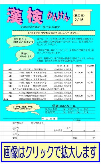TOP›教室からのお知らせ›取手:2月 漢字検定開催のお知らせ