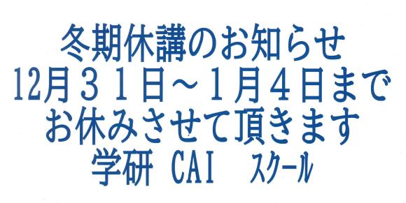『冬期休講のお知らせ』 R7年中は大変お世話様になりました。 スタッフ一同、御礼を申し上げます。 年末年始は、 12月31日〜1月4日 まで、お休みさせて頂きます。 宜しくお願いいたします。 また、新年R8年も変わらずご支援頂けますよう 努力して参ります。 宜しくお願いいたします。 学研 CAI スク-ル