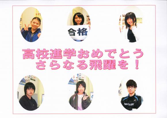 こんにちは、学研CAIスク-ルです。 卒業生のみんな、高校進学おめでとう。 春の嵐もすぎ、穏やかに入学式を 迎えられたのも、みんなの努力が 報われたからでしょう。 これからは、中学で学んだ知識を さらに生かして、高校で大きく 羽ばたいて下さい。 CAIスク-ルでは、高校コ-スもありますから、 もし勉強が難しくなったら 学研でまた勉強して下さい。 高校では、自由も増しますが 自己責任も増大します。 厳しく自分を律して、素晴しい高校生活を 送って下さい。 頑張れ、新高校生!