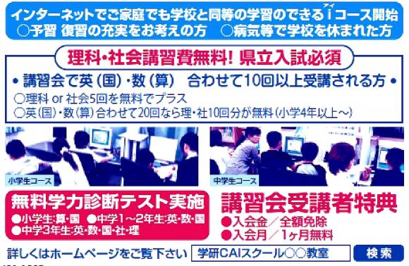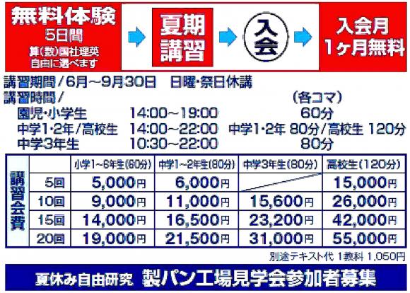 《 画像は、クリックすると拡大します 》 講習期間: 6月〜9月28日 講習教科: 小学生 算・国・社・理・Jr英語 中学生 数・英・理・社・国 高校生 数・英・理・社 講習費用: 講習会要旨: 各学年の復習と先取り学習 お子様の学力、進度に合わせた 個別指導を行います。 中3生は、1・2年の総復習 講習特典: 講習会で数(算)又は英(国)を 10回受講された方には、 理科又は社会5回分を無料で 学習できます。 入会月 1ヶ月無料 詳細は、電話でお問い合わせ下さい。 TEL 84-1819