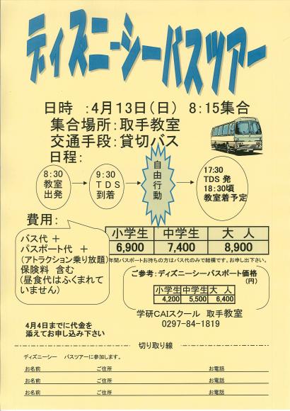 《画像はクリックすると拡大します》 ディズニ-シ- バスツア- 開催のお知らせ 日時 :4月13日(日) 時間 : 8:30 教室出発 19:30頃教室帰着 交通手段: 貸し切りバス 費用 :小学生 6900円 グル-プ行動 中高学生7400円 自由行動 大人 8900円 詳細は、教室にお問い合わせ下さい。 Tel 0297-84-1819