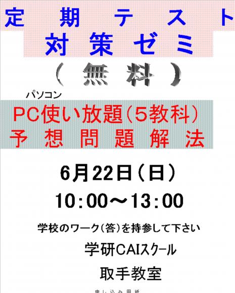 定期テスト・無料対策ゼミ 中1〜3年生 《 画像は、クリッツクすると拡大します 》 《 中学生対象 定期試験対応:無料対策ゼミ 》 ■ 6月22日(日) ■ 10:00〜13:00 ■ 対象 中学1〜3年生(会員 外部生) ■ 内容 過去問・模擬問題の解答解説 * 学校のワ-クを持参 *