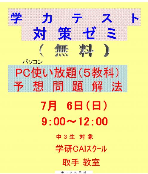 2014年07月06日 日曜日 学力テスト・対策 無料ゼミ 取手2中3年生対象 ( 教室からのお知らせ ) |