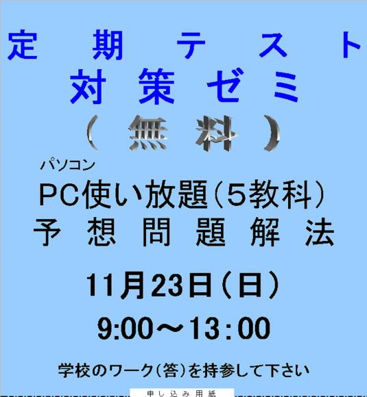 中学生対象:定期試験対策無料ゼミ 日時: 11月23日(日)AM.9:00 教科: 英・数:理・社 学校のワ-クを持参のこと