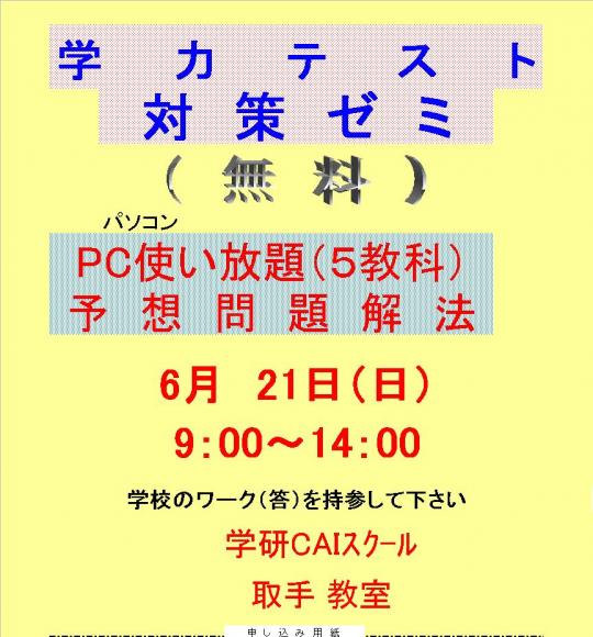 無料 期末試験対策授業 開催のお知らせ 期日 6月21日(日) 時間 9-00〜14:00 要旨 過去問 ワ-クによる試験対策 詳細 お電話でお尋ね下さい TEL 0297-84-1819