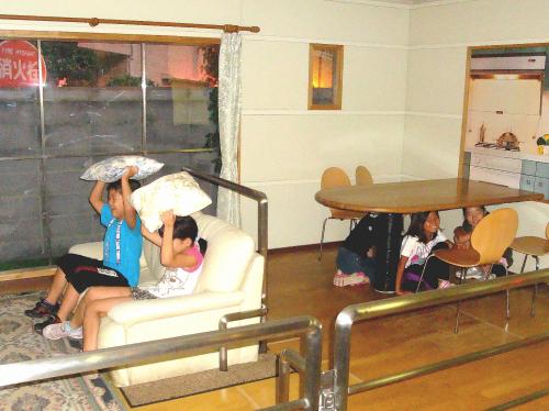 程の揺れでも家具の下に避難する。